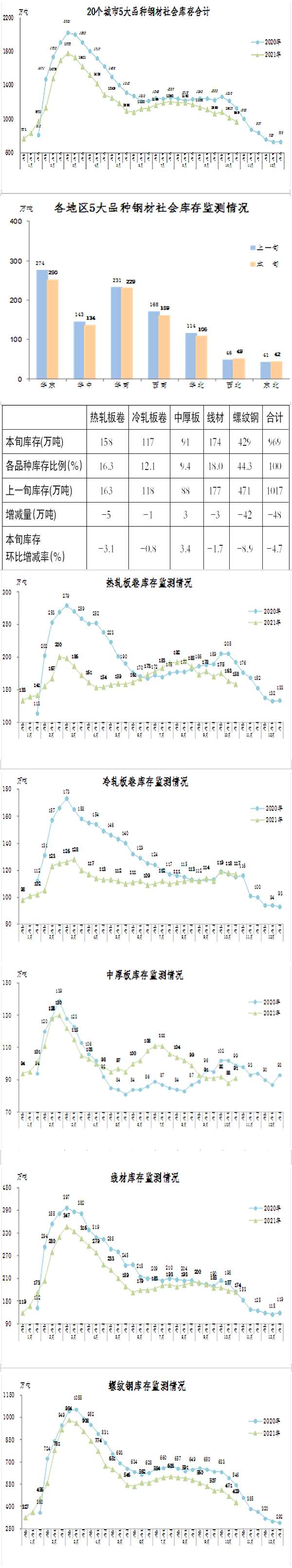 10月下旬,20個城市5大品種鋼材社會庫存969萬噸,環比減少47萬噸,下降4.7%,庫存連續下降;比9月下旬減少96萬噸,下降9.0%;比年初增加239萬噸,上升32.7%;同比減少158萬噸,下降14.0%。