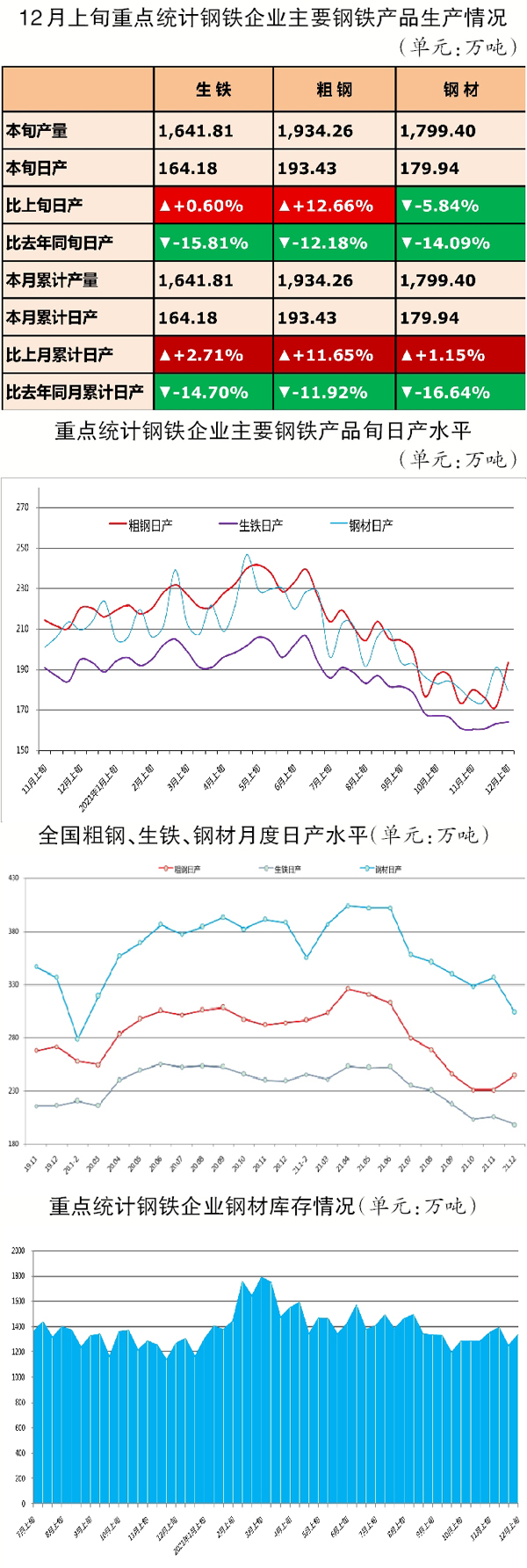 12月上旬重點統計鋼鐵企業產量、庫存情況顯示: