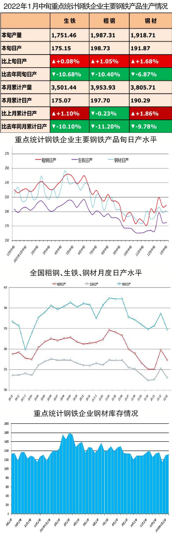 2022年1月中旬,重點統計鋼鐵企業共生產粗鋼1987.31萬噸、生鐵1751.46萬噸、鋼材1918.71萬噸。其中,粗鋼日產198.73萬噸,環比上升1.05%;生鐵日產175.15萬噸,環比上升0.08%;鋼材日產191.87萬噸,環比上升1.68%。