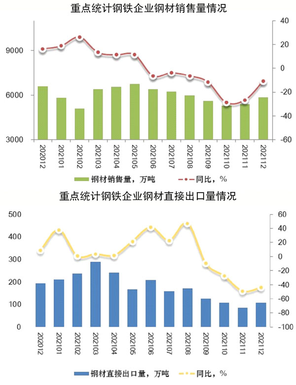 上述統計數據表明:受限產、限電、下遊行業用鋼需求減弱等因素的影響,自2021年6月(yue)份(fen)以(yi)來(lai),重(zhong)點(dian)統(tong)計(ji)鋼(gang)鐵(tie)企(qi)業(ye)鋼(gang)材(cai)銷(xiao)售(shou)連(lian)續(xu)下(xia)降(jiang),但(dan)在(zai)振(zhen)作(zuo)工(gong)業(ye)經(jing)濟(ji)運(yun)行(xing)政(zheng)策(ce)措(cuo)施(shi)的(de)引(yin)領(ling)下(xia),鋼(gang)鐵(tie)行(xing)業(ye)需(xu)求(qiu)逐(zhu)步(bu)企(qi)穩(wen)回(hui)升(sheng),日(ri)銷(xiao)環(huan)比(bi)連(lian)續(xu)2個月上升。隨著國家取消鋼材出口退稅,鋼材出口同比連續4個月下降,鋼材直接出口量呈減少態勢,雖然2021年12月份有所回升,環比上升26.40%,但仍處於低位。鋼材產銷率當月小幅下降,鑒於季節性、環境性等多重因素對需求端的影響,鋼鐵供需變化仍需密切跟蹤和關注,以實現供需動態平衡。