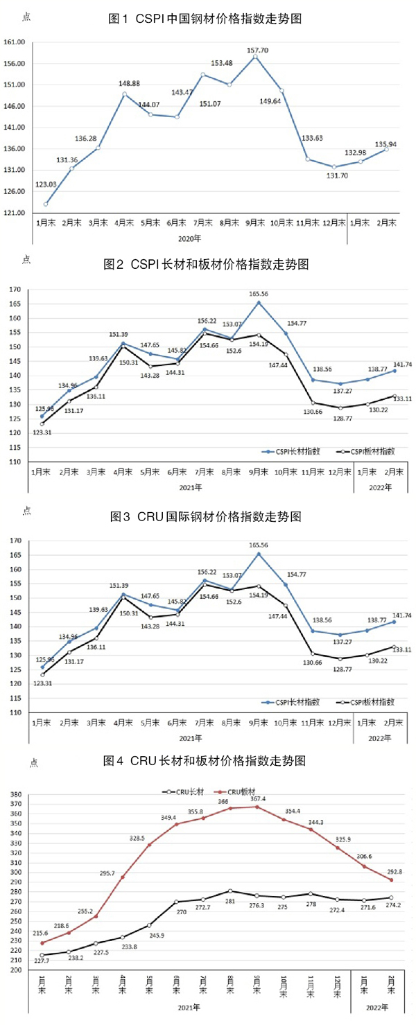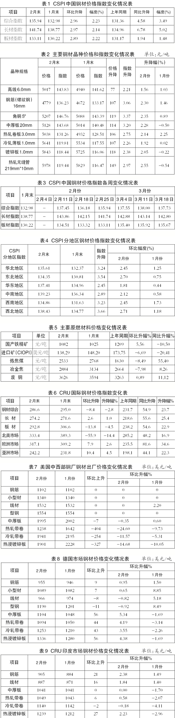 據鋼協監測,2月末,中國鋼材價格指數(CSPI)為135.94點,環比上升2.96點,環比升幅為2.23%,較1月份加大1.25個百分點;同比上升4.58點,升幅為3.49%。(見圖1)