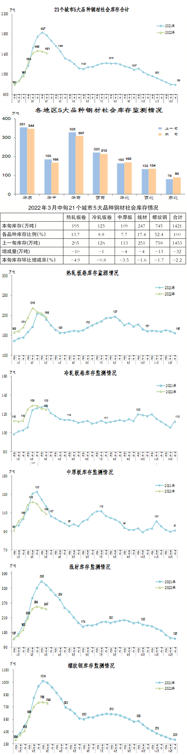 3月中旬,21個城市5大品種鋼材社會庫存為1421萬噸,環比減少32萬噸,下降2.2%,庫存繼續呈下降走勢;比年初增加633萬噸,上升80.3%;同比減少351萬噸,下降19.8%。