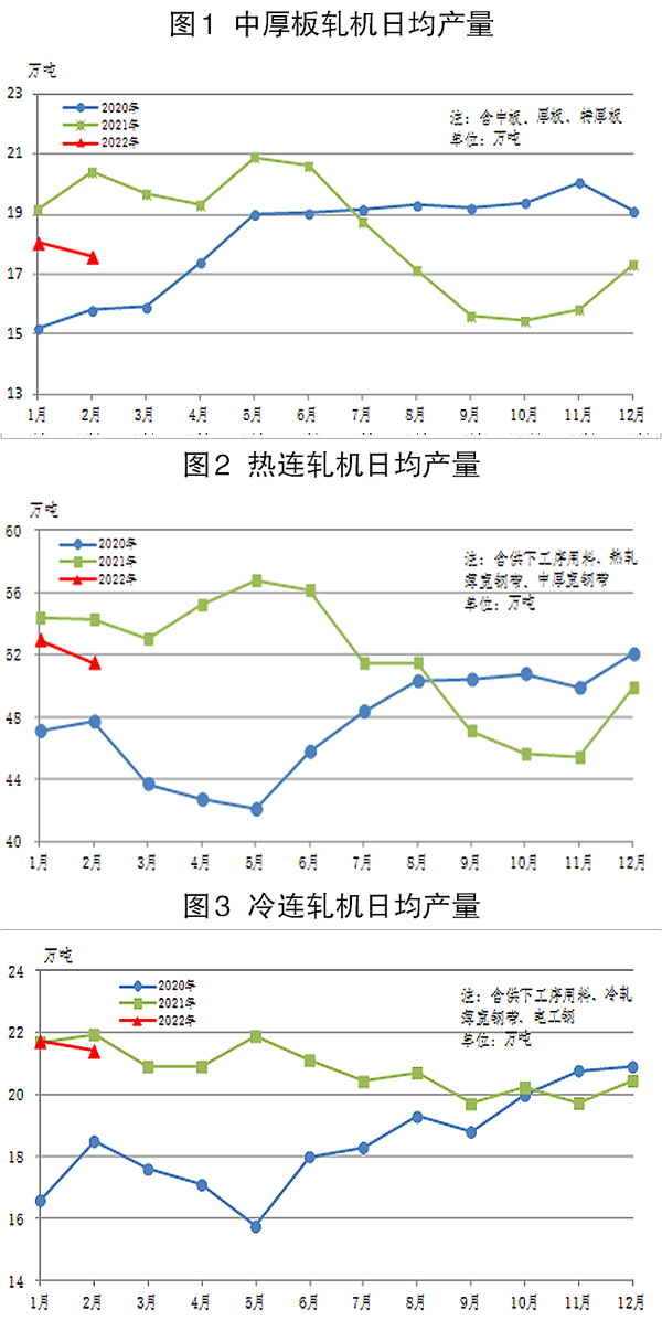 2月份,熱連軋機生產1443萬噸,同比減少75萬噸,下降5.0%。其中,商品量為825萬噸,同比減少36萬噸,下降4.1%;供下工序用料618萬噸,同比減少40萬噸,下降6.0%。1月~2月份,累計生產3173萬噸,同比減少107萬噸,下降3.3%。