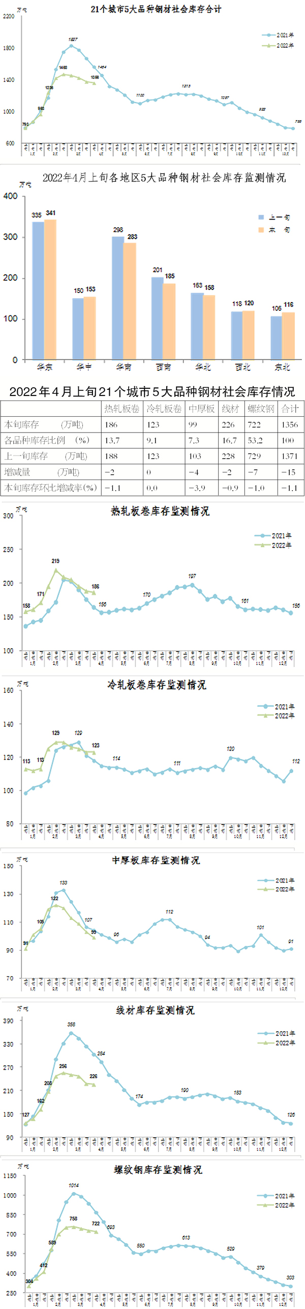 注:從2022年開始,鋼材社會庫存重點監測城市由20個增加到21個,增加城市為蘭州,旬報中社會庫存總量和5大品種庫存量的上年數據均同口徑做出調整。