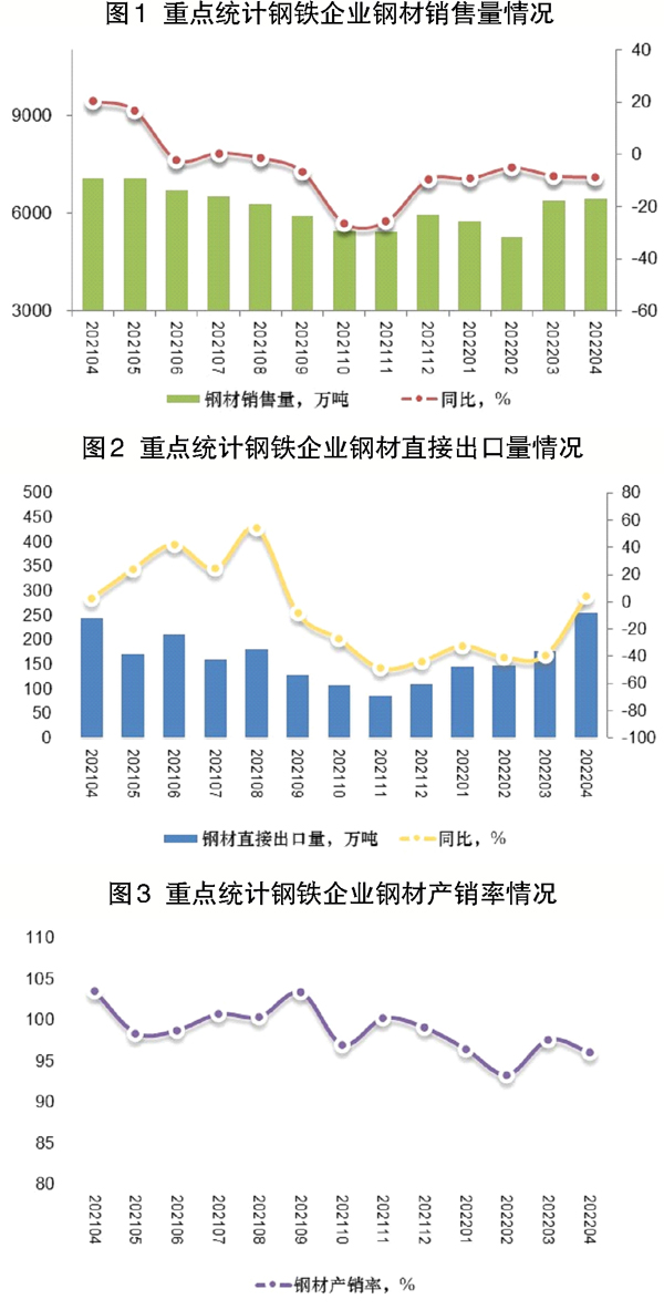 上述統計數據表明:受部分地區新冠肺炎疫情防控形勢趨緊、需求增長延遲、物流交通受阻等多重因素疊加影響,重點統計鋼鐵企業鋼材銷售同比連續9個月下降,但鋼鐵消費指標的月度環比數據呈回升態勢,日銷量環比連續3個月上升,供需基本均衡。4月份,鋼材直接出口量環比上升43.99%,增幅進一步擴大,近5個月呈增長態勢;鋼材直接出口量同比由降轉增。鋼材產銷率由升轉降,鑒於新冠肺炎疫情反彈、經濟下行壓力加大等多重因素對需求端的影響,鋼鐵供需變化仍需密切跟蹤和關注,以實現供需動態平衡。