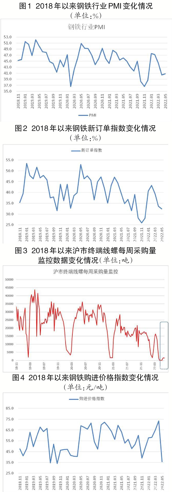5月份,鋼材需求繼續收縮,新訂單指數為32.4%,環比下降1.2個百分點,連續3個月呈環比下降趨勢,且均低於40%。在鋼材終端交易方麵,從監測的滬市終端線材、螺紋鋼采購數據來看,由於疫情防控形勢好轉,上海終端采購整體稍有恢複,但距離正常水平仍有較大的差距。
