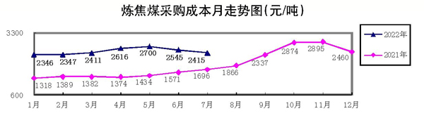 7月份,對標企業煉焦煤加權平均折算成幹基的采購成本為2414.66元/噸,環比下降130.76元/噸,降幅為5.14%。1月—7月份,煉焦煤累計平均折算成幹基的采購成本為2481.60元/噸,同比升高1029.76元/噸,升幅為70.93%。