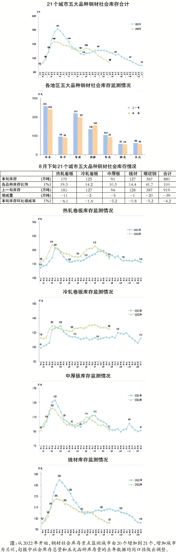 9月上旬,分地區來看,七大區域除西南地區庫存環比上升外,其他地區繼續呈下降走勢。具體情況為:華南地區庫存環比減少20萬噸,下降9.2%,為減量最大地區;華東地區減少16萬噸,下降6.3%;華北地區減少11萬噸,下降10.7%,為降幅最大地區;東北地區減少5萬噸,下降8.3%;華中地區減少5萬噸,下降5.3%;西北地區減少2萬噸,下降3.6%;西南地區庫存環比增加20萬噸,上升14.9%。