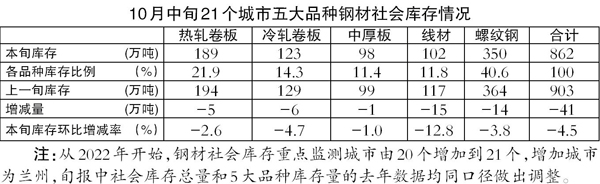 10月中旬,21個城市五大品種鋼材社會庫存為862萬噸,環比減少41萬噸,下降4.5%,庫存由升轉降;比今年初增加74萬噸,上升9.4%;比去年同期減少180萬噸,下降17.2%。