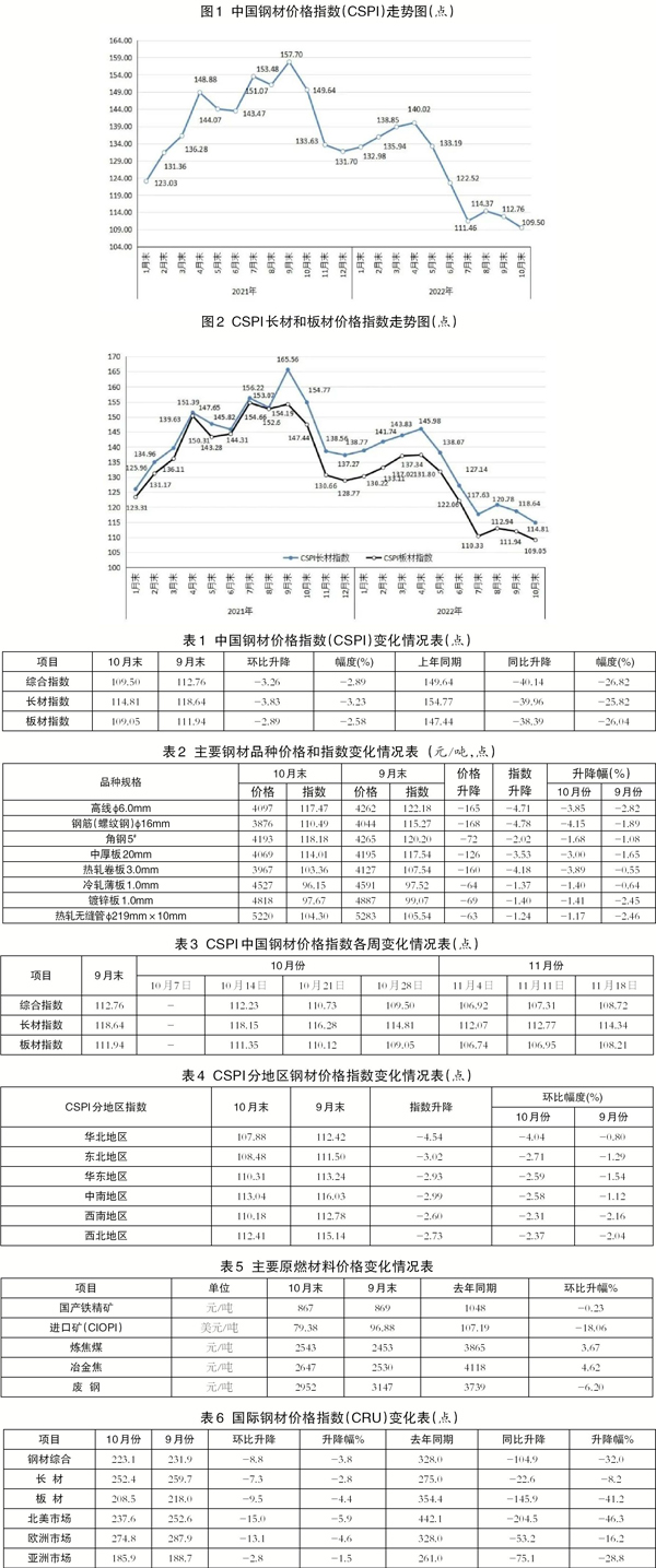 10月份,CSPI綜合指數總體呈窄幅波動下行走勢,各周價格指數基本上在110點上下波動;進入11月份以來,第一周鋼材價格繼續下降,第二周、第三周小幅回升。