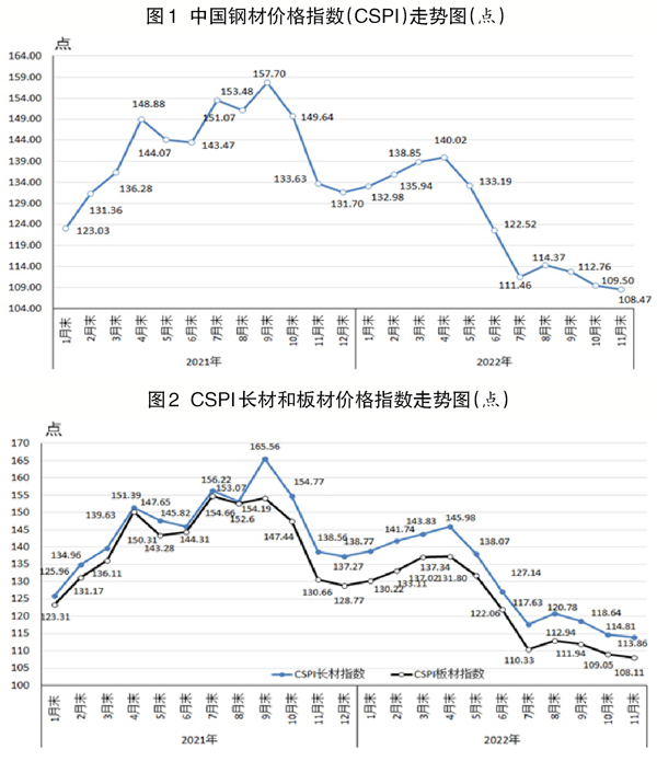 11月末,CSPI長材指數為113.86點,環比下降0.95點,降幅為0.83%;CSPI板材指數為108.11點,環比下降0.94點,降幅為0.86%,比長材降幅高0.03個百分點;與去年同期相比,長材、板材指數分別下降24.70點、22.55點,降幅分別為17.83%、17.26%。