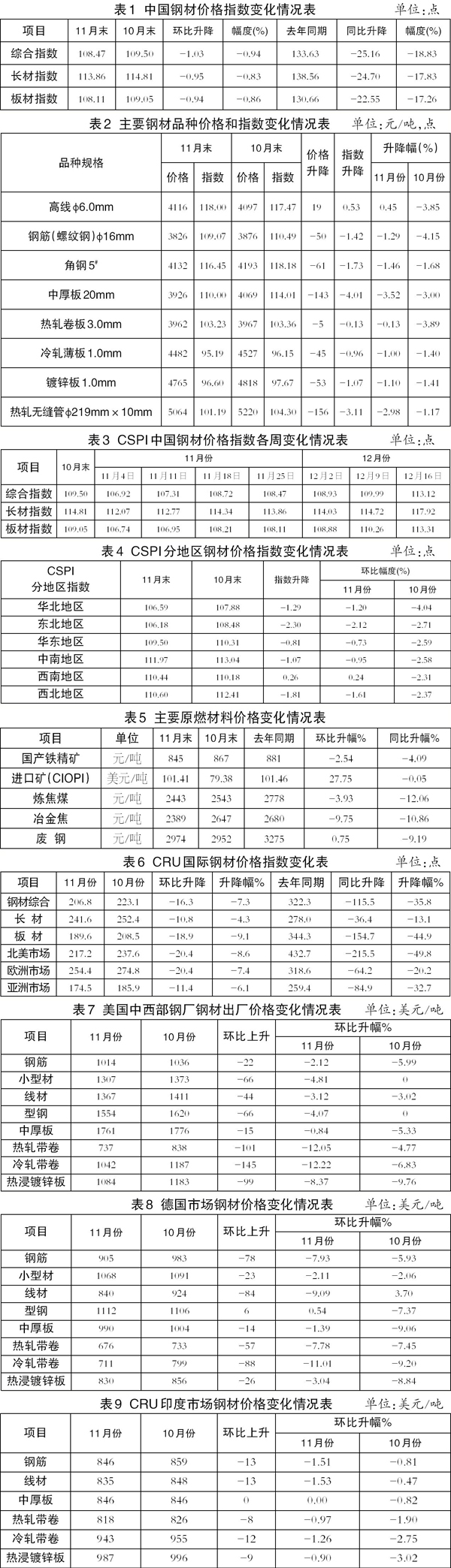 11月份,CSPI綜合指數總體呈窄幅波動走勢。其中第一周下降,第二周、第三周小幅上行,第四周小幅下降;進入12月份以來,鋼材價格連續3周回升。