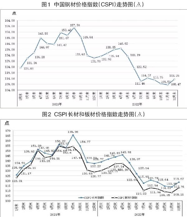 2022年12月末,CSPI長材指數為118.67點,環比上升4.81點,升幅為4.22%;CSPI板材指數為112.91點,環比上升4.80點,升幅為4.44%,比長材升幅高0.22個百分點;與2021年同期相比,長材、板材指數分別下降18.60點、15.86點,降幅分別為13.55%、12.32%。