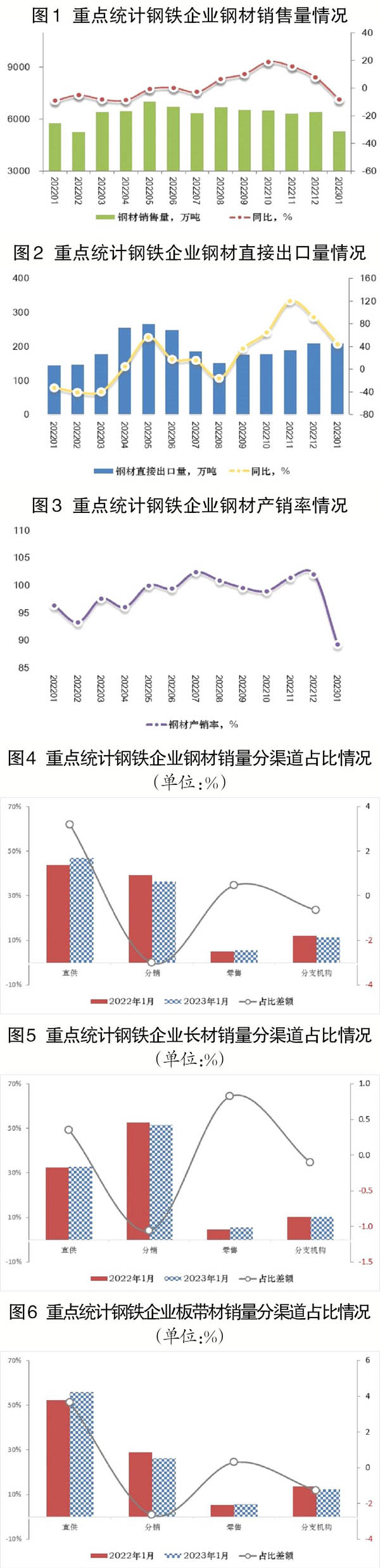 1月份,重點統計鋼鐵企業鋼材直供銷量同比下降3.33%,占鋼材國內銷售量的46.90%,同2022年1月份相比上升了3.19個百分點;鋼材分銷銷量同比下降16.79%,占鋼材國內銷售量的6.25%,同2022年1月份相比下降了3.01個百分點;鋼材零售銷量同比下降1.55%,占鋼材國內銷售量的5.54%,同2022年1月份相比上升了0.47個百分點;鋼材分支機構銷量同比下降14.19%,占鋼材國內銷售量的11.30%,同2022年1月份相比下降了0.65個百分點。
