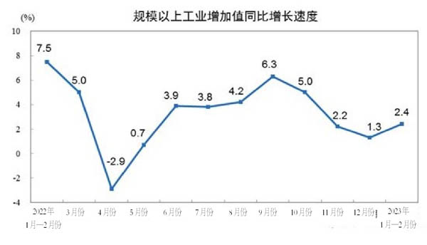 分行業看,1月—2月份,41個大類行業中有22個行業增加值保持同比增長。其中,煤炭開采和洗選業增長5.0%,石油和天然氣開采業增長4.2%,農副食品加工業增長0.3%,酒、飲料和精製茶製造業下降0.3%,紡織業下降3.5%,化學原料和化學製品製造業增長7.8%,非金屬礦物製品業增長0.7%,黑色金屬冶煉和壓延加工業增長5.9%,有色金屬冶煉和壓延加工業增長6.7%,通用設備製造業下降1.3%,專用設備製造業增長3.9%,汽車製造業下降1.0%,鐵路、船舶、航空航天和其他運輸設備製造業增長9.7%,電氣機械和器材製造業增長13.9%,計算機、通信和其他電子設備製造業下降2.6%,電力、熱力生產和供應業增長2.3%。