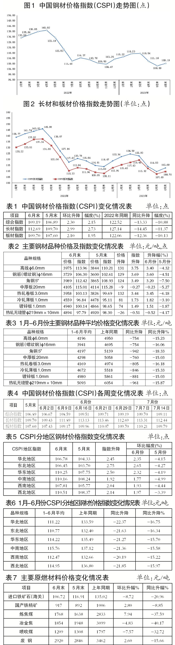 1月—6月份,CSPI長材指數平均值為117.53點,同比下降21.73點,降幅為15.60%;CSPI板材指數平均值為113.51點,同比下降18.41點,降幅為13.96%,降幅比長材低1.65個百分點。