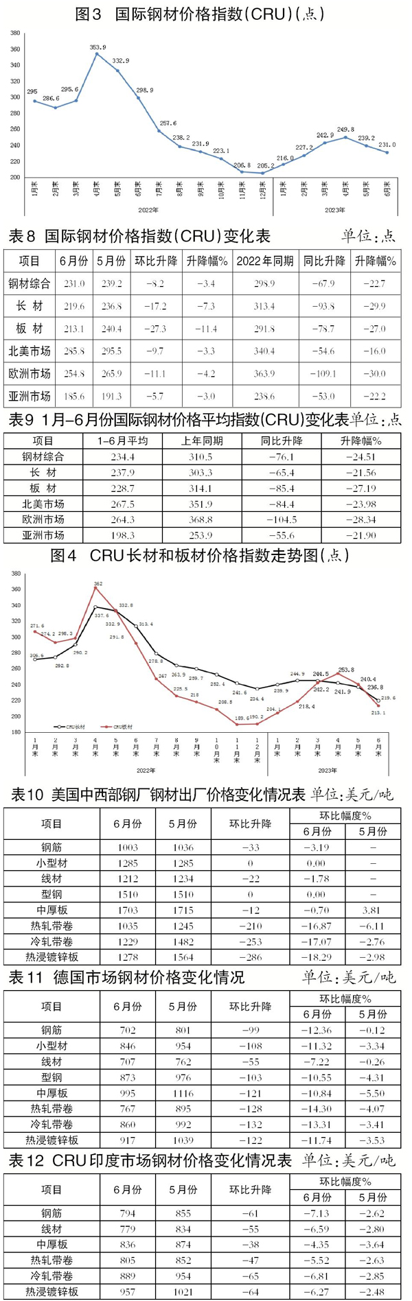 6月份,CRU長材指數為219.6點,環比下降17.2點,降幅為7.3%,降幅較5月份加大5.2個百分點;CRU板材指數為213.1點,環比下降27.3點,降幅為11.4%,降幅較5月份擴大6.1個百分點。與去年同期相比,CRU長材指數下降93.8點,降幅為29.9%;CRU板材指數下降78.7點,降幅為27.0%。