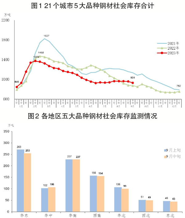 9月中旬,21個城市五大品種鋼材社會庫存為931萬噸,環比減少26萬噸,下降2.7%,庫存降幅略有擴大;比今年初增加179萬噸,上升23.8%;比去年同期增加59萬噸,上升6.8%。