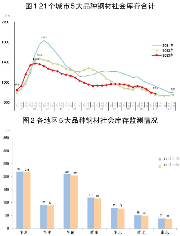 11月中旬,21個城市5大品種鋼材社會庫存為773萬噸,環比減少19萬噸,下降2.4%,庫存延續下降態勢,降幅有所收窄;比今年初增加21萬噸,上升2.8%;比去年同期增加22萬噸,上升2.9%。