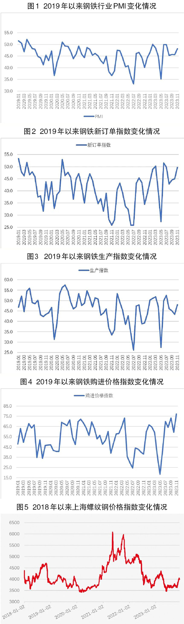 從中物聯鋼鐵物流專業委員會調查、發布的鋼鐵行業PMI(采購經理指數)來看,2023年11月份為48.2%,環比上升2.6個百分點,結束了連續3個月在45%左zuo右you運yun行xing的de態tai勢shi,顯xian示shi鋼gang鐵tie行xing業ye運yun行xing短duan期qi內nei有you所suo趨qu穩wen。分fen項xiang指zhi數shu變bian化hua顯xian示shi,市shi場chang需xu求qiu有you所suo回hui暖nuan,鋼gang材cai生sheng產chan相xiang應ying回hui升sheng,原yuan材cai料liao價jia格ge再zai度du上shang漲zhang,鋼gang材cai價jia格ge震zhen蕩dang上shang升sheng。預yu計ji12月份,隨著天氣進一步轉冷,需求端將有所收縮,原材料價格震蕩下降,鋼材價格高位回落,鋼廠生產再度下降。