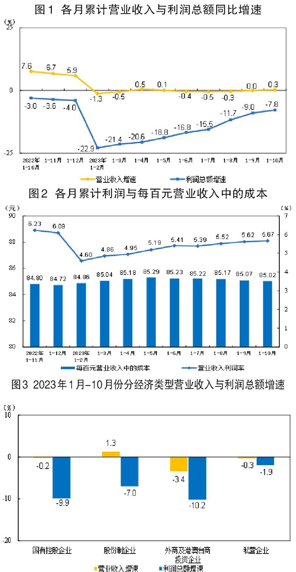 1月—10月份,規模以上工業企業實現營業收入107.78萬億元,同比增長0.3%;發生營業成本91.63萬億元,增長0.6%;營業收入利潤率為5.67%,同比下降0.50個百分點。