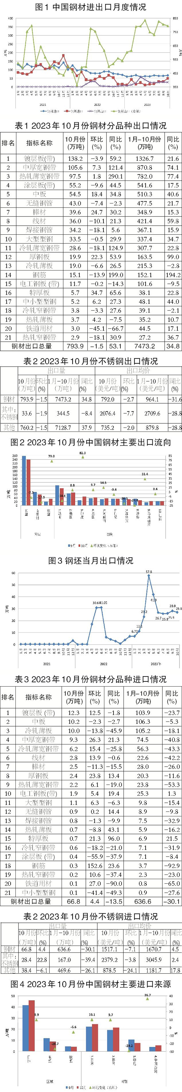 1月—10月份,我國進口鋼材636.6萬噸,同比減少30.1%;進口平均單價為1670.7美元/噸,同比上漲4.5%;進口鋼坯247.6萬噸,同比減少67.6%。1月—10月份,我國出口鋼材7473.2萬噸,同比增長34.8%;出口平均單價為964.1美元/噸,同比下跌31.6%;出口鋼坯274.1萬噸,同比增加181.8萬噸;粗鋼淨出口7191.7萬噸,同比增加2817.6萬噸,增幅為64.4%。