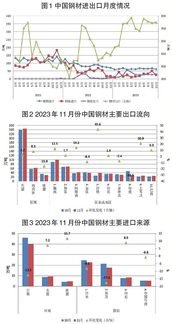2023年11月份,我國鋼材出口環比回升至800萬噸以上。線材、焊接鋼管和熱軋薄寬鋼帶等品種出口量增長顯著,對越南、沙特出口增長較大。