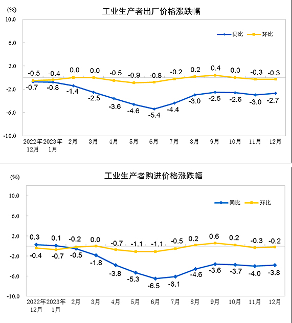 2023年,工業生產者出廠價格比2022年下降3.0%,工業生產者購進價格下降3.6%。 (郭同炬)
