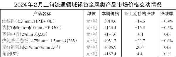 2月上旬,φ20毫米HRB400E螺紋鋼價格為3910.6元/噸,環比下降14.5元/噸,降幅為0.4%;φ8毫米~φ10毫米HPB300線材價格為4120.4元/噸,環比下降13元/噸,降幅為0.3%;20毫米Q235普通中板價格為4141.6元/噸,環比上漲16.1元/噸,漲幅為0.4%;4.75毫米~11.5毫米Q235熱軋普通卷板價格為4051.7元/噸,環比下降22.7元/噸,降幅為0.6%;φ219毫米×6毫米20#無縫鋼管價格為4696.9元/噸,環比上漲20.0元/噸,漲幅為0.4%;5#角鋼價格為4182.4元/噸,環比上漲4.4%,漲幅為0.1%。(郭同炬)
