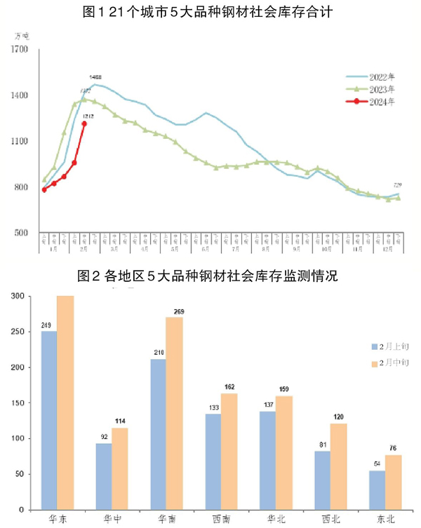 2月中旬,21個城市5大品種鋼材社會庫存為1212萬噸,環比增加256萬噸,上升26.8%,庫存大幅上升;比今年初增加483萬噸,上升66.3%;比2023年同期減少160萬噸,下降11.7%。