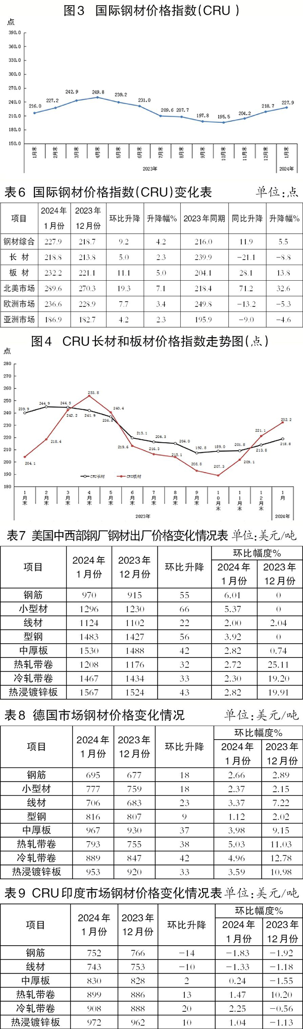 1月份,CRU亞洲鋼材價格指數為186.9點,比2023年12月份上升4.2點,升幅為2.3%。日本製造業PMI為48.0%,環比上升0.1個百分點;韓國製造業PMI為51.2%,環比上升1.3個百分點;印度製造業PMI為56.5%,環比上升1.6個百分點;中國製造業PMI為49.2%,環比回升0.2個百分點。1月份,印度市場長材價格持續下降,熱軋帶卷價格穩中有升,其餘品種價格由降轉升。