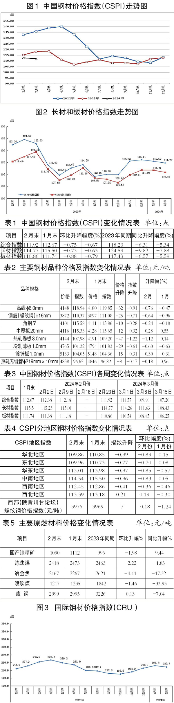 截至2月末,CSPI長材指數為114.77點,環比下降0.73點,降幅為0.63%;CSPI板材指數為110.86點,環比下降0.88點,降幅為0.79%。與上年同期相比,截至2月末的CSPI長材、板材指數分別下降9.82點、6.57點,降幅分別為7.88%、5.59%。