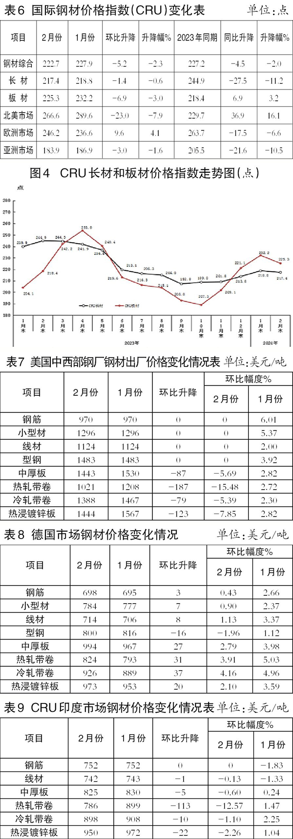 2月份,CRU國際鋼材價格指數為222.7點,環比下降5.2點,降幅為2.3%,為連續3個月連續上升後首次下降;同比下降4.5點,同比降幅為2.0%。
