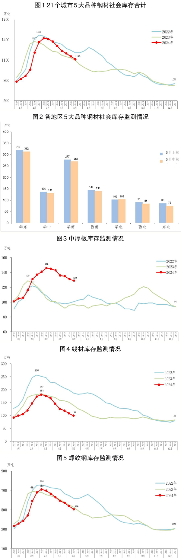 5月中旬,21個城市5大品種鋼材社會庫存為1113萬噸,環比減少42萬噸,下降3.6%,庫存持續下降;比今年初增加384萬噸,上升52.7%;比上年同期增加19萬噸,上升1.7%。