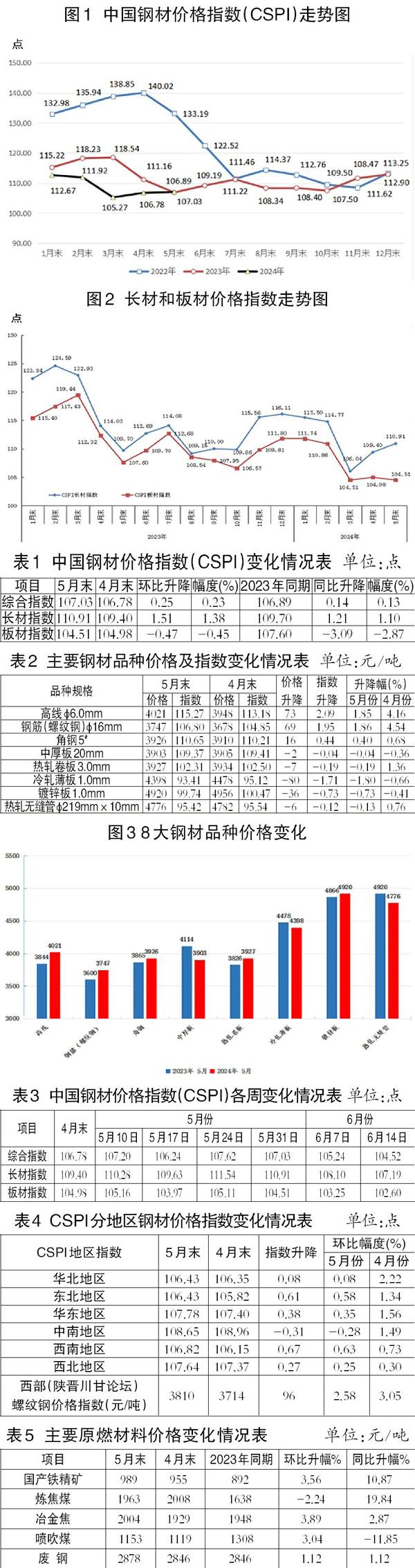 截至5月末,CSPI長材指數為110.91點,環比上升1.51點,升幅為1.38%;CSPI板材指數為104.51點,環比下降0.47點,降幅為0.45%。與上年同期相比,CSPI長材、板材指數分別上升1.21點、下降3.09點,升幅為1.10%、降幅為2.87%。