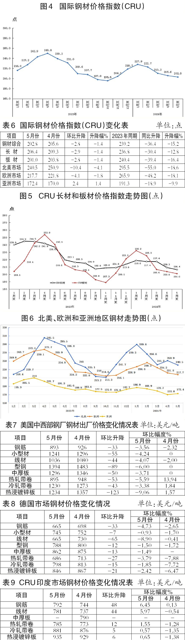 1月—5月份,CRU長材指數平均值為213.9點,同比下降27.7點,降幅為11.5%;CRU板材指數平均值為213.8點,同比下降18.0點,降幅為7.8%。