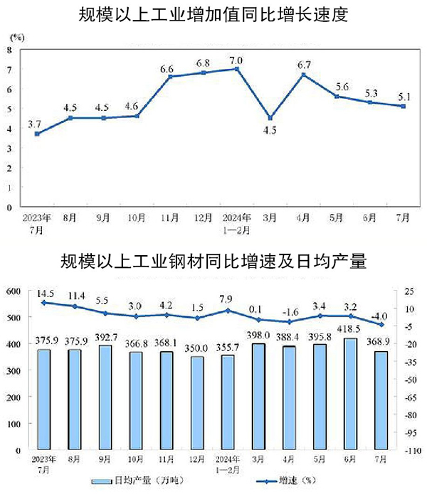 本報訊 國家統計局消息,7月份,規模以上工業增加值同比實際增長5.1%(增加值增速均為扣除價格因素的實際增長率),環比增長0.35%。其中,黑色金屬冶煉和壓延加工業增加值同比下降1.5%。1月—7月份,規模以上工業增加值同比增長5.9%。