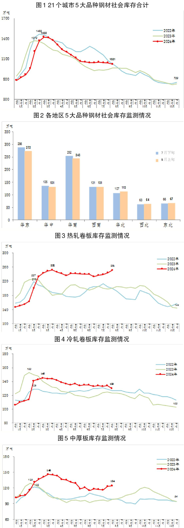 8月上旬,分地區來看,7大區域庫存環比各有升降,具體情況為:華東地區庫存環比減少14萬噸,下降4.9%,為減量和降幅最大地區;華南地區減少9萬噸,下降3.6%;華中地區減少4萬噸,下降3.0%;西北地區和東北地區均減少1萬噸,分別下降1.6%和1.5%;華北地區環比增加6萬噸,上升5.6%;西南地區庫存環比持平。
