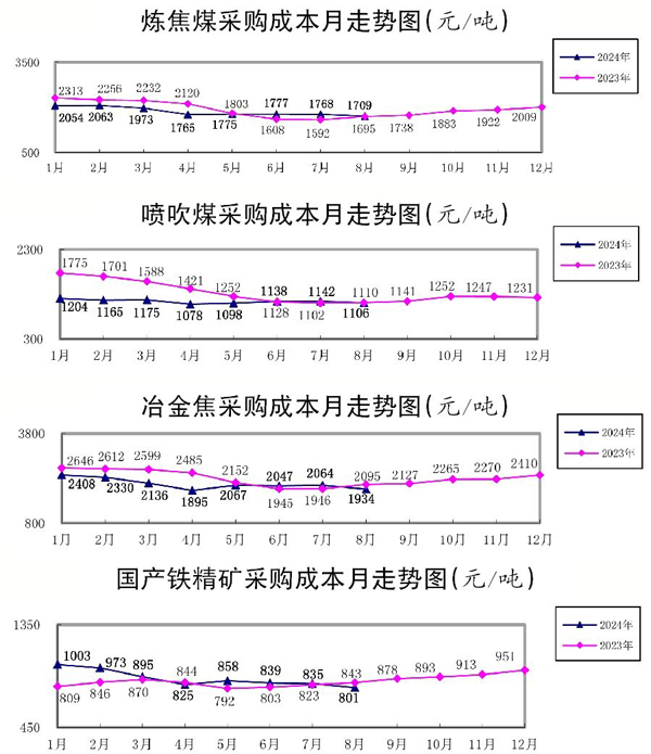 8月份,各原燃材料品種采購成本環比下降,多數品種降幅超過3%。