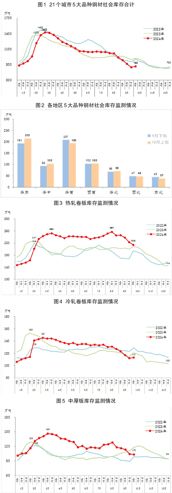10月上旬,21個城市5大品種鋼材社會庫存為763萬噸,環比增加15萬噸,上升2.0%,庫存連續8旬下降後首次上升;比今年初增加34萬噸,上升4.7%;比上年同期減少161萬噸,下降17.4%。