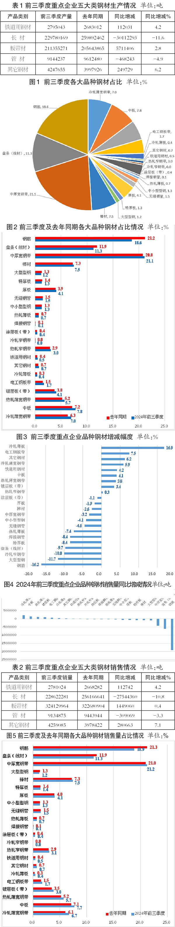 前三季度,重點企業生產的22大類品種鋼材中,有13個品種產量同比下降,其中鋼筋、線材、中厚寬鋼帶、大型型鋼、特厚板、焊接鋼管等品種產量大幅下降,帶動了重點企業鋼材總量同比下降;9個品種產量有所增長,其中中板、熱軋薄寬鋼帶、鍍層板(帶)等品種無論增量還是增幅都相對較大。