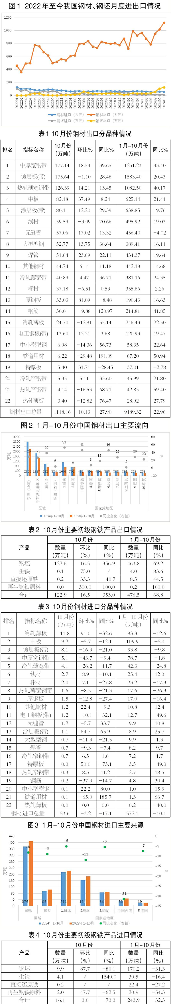 繼9月份鋼材出口量9年來首次突破1000萬噸關口後,10月份的鋼材出口量再度創下今年初以來的峰值。鋼材出口價格持續下行,鋼材出口“量增額降”的態勢持續,部分主要品種出口均價降幅環比收窄。