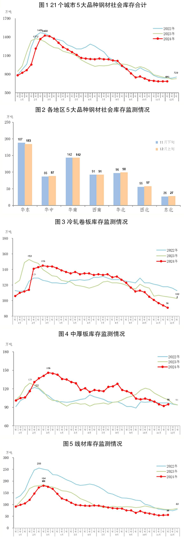 12月上旬,分地區來看,7大區域鋼材社會庫存環比各有升降,具體情況為:華東地區庫存環比減少4萬噸,下降2.1%,為減量和降幅最大地區;華南地區和西南地區庫存環比持平;華北地區增加2萬噸,上升2.1%;西北地區增加2萬噸,上升3.6%;東北地區增加1萬噸,上升3.8%;華中地區增加1萬噸,上升1.2%。
