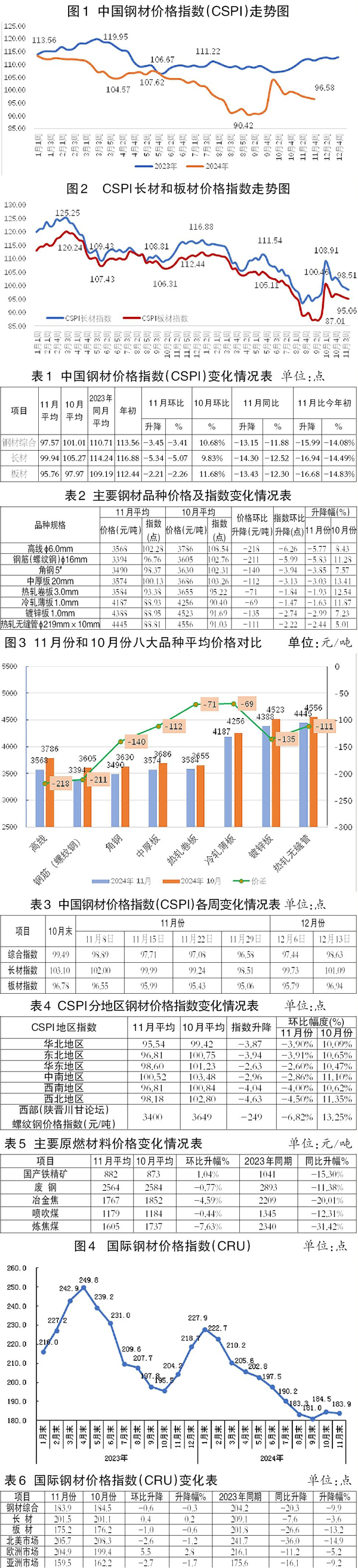 據中國鋼鐵工業協會監測,11月份,中國鋼材價格指數(CSPI)平均值為97.57點,環比下降3.45點、降幅為3.41%,同比下降13.15點、降幅為11.88%。其中,CSPI長材指數平均值為99.94點,環比下降5.34點、降幅為5.07%,同比下降14.30點、降幅為12.52%;板材指數平均值為95.76點,環比下降2.21點、降幅為2.26%,同比下降13.43點、降幅為12.30%。