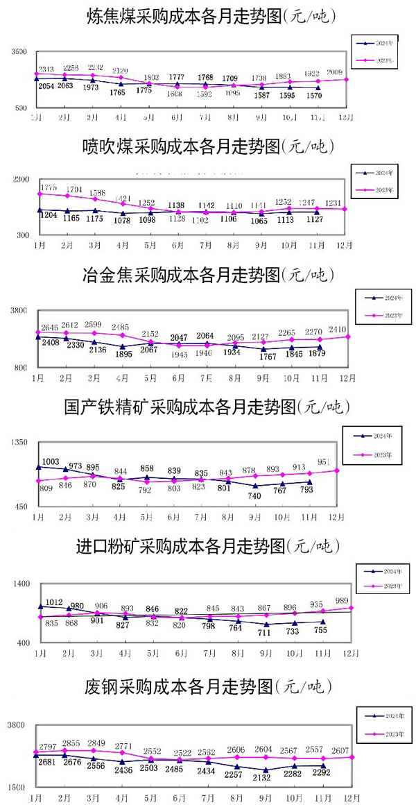2024年1月—11月份,煉焦煤采購成本同比下降7.26%;冶金焦同比下降11.22%;國產鐵精礦同比下降0.23%,進口粉礦同比下降4.68%;廢鋼同比下降8.28%。