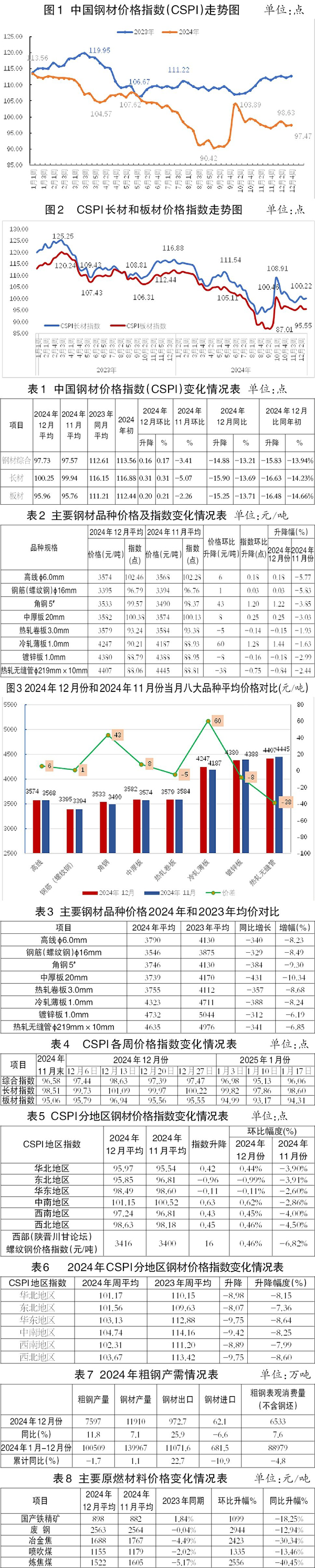 從2024年全年鋼材價格運行情況看,2024年CSPI平均值為102.47點,同比下降9.37點、降幅為8.38%。分月情況看,2024年1月—3月份鋼材價格大幅下行,4月—5月份波動上行,6月—7月份在螺紋鋼新舊國標交替引發市場恐慌情緒、淡季效應等因素影響下快速下行,8月—9月份鋼材價格震蕩運行,受9月26日一係列增量政策影響,鋼材價格在9月末強勢拉漲,進入10月份,鋼材價格回歸基本麵,10月—11月份震蕩下行,12月份繼續窄幅震蕩。