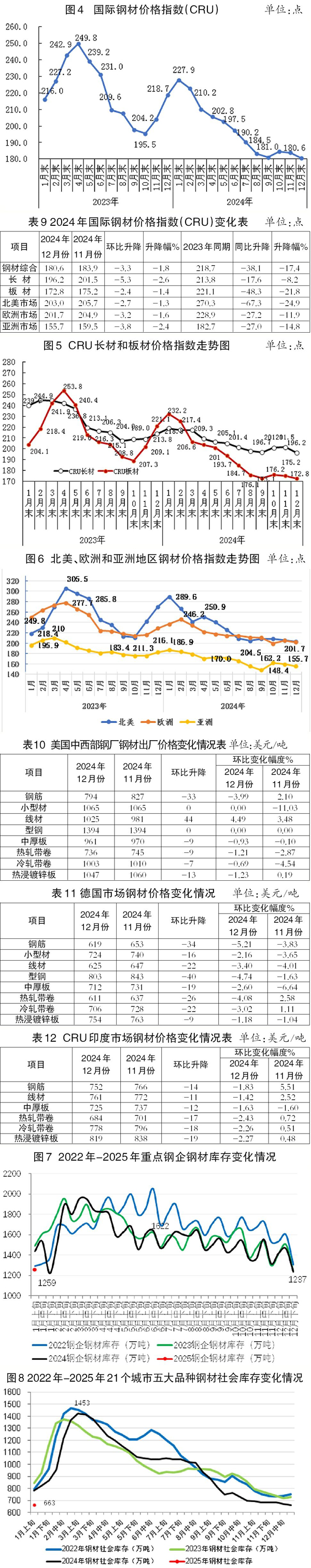 2024年12月份,CRU北美鋼材價格指數為203.0點,環比下降2.7點、降幅為1.3%。美國製造業PMI為49.3%,環比上升0.9個百分點,但仍處於萎縮區間。2024年12月份,美國中西部鋼廠鋼材價格以下降為主,除線材明顯上升,小型材、型鋼環比持平外,其餘均下降。