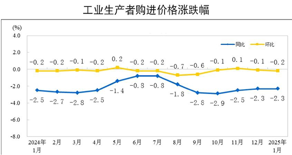 本報訊 1月份,全國工業生產者購進價格同比下降2.3%,降幅與2024年12月份相同,環比下降0.2%。其中,黑色金屬材料類購進價格同比下降8.9%,環比下降0.3%。