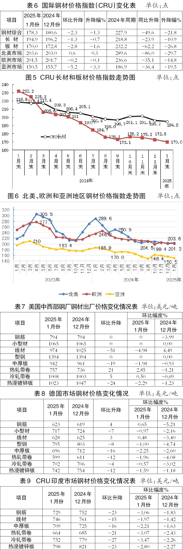 1月份,CRU亞洲鋼材價格指數為150.5點,比2024年12月份下降5.2點、降幅為3.3%。1月份,日本製造業PMI為48.7%,環比下降0.9個百分點;韓國製造業PMI為50.3%,環比上升1.3個百分點;印度製造業PMI為57.7%,環比上升1.3個百分點;中國製造業PMI為49.2%,環比回升0.2個百分點。1月份,印度市場長材、板材價格均持續下降。