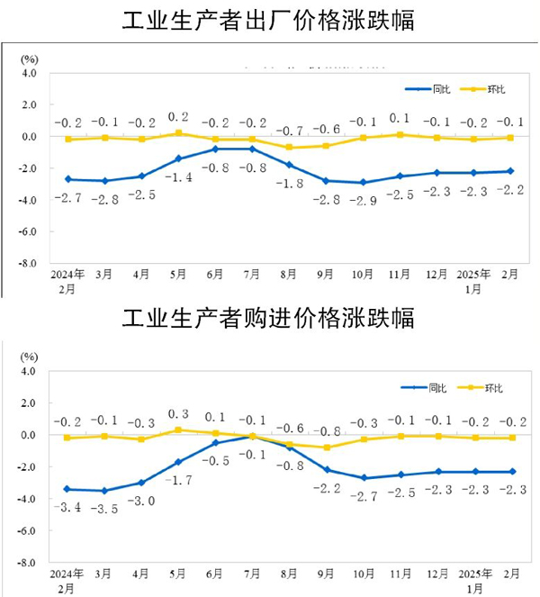 1月—2月份平均,工業生產者出廠價格比2024年同期下降2.2%,工業生產者購進價格下降2.3%。 (郭同炬)